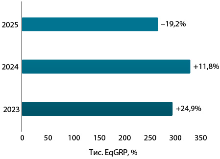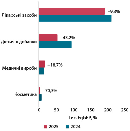 Показник EqGRP** у досліджуваний період знизився на 19,2%, що контрастує з активним зростанням у 2023–2024 рр. (рис. 2). Спад відзначається майже в усіх категоріях товарів «аптечного кошика», за винятком медичних виробів. Особливо помітне зниження активності зафіксовано у сегменті косметики та дієтичних добавок (рис. 3).