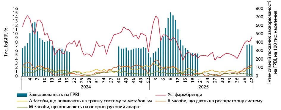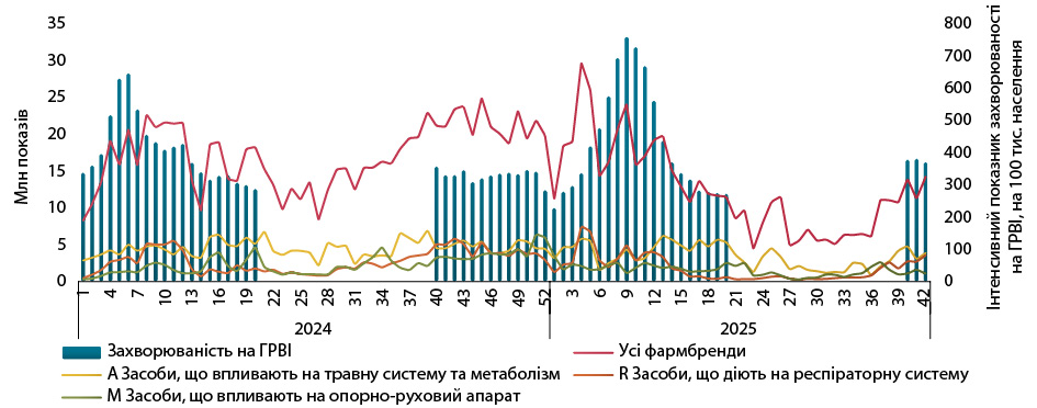 Основну частку телереклами фармацевтичних брендів традиційно формують лікарські засоби, серед яких лідирують препарати, що впливають на травну систему та метаболізм (група А АТС-класифікації 1-го рівня), та лікарські засоби, що діють на респіраторну систему (група R), — категорії з яскраво вираженою сезонністю попиту. Як свідчить потижнева динаміка, на початку 2025 р. відзначали вищий рівень захворюваності на грип і гострі респіраторні вірусні інфекції (ГРВІ) порівняно з тим самим періодом попереднього року, пік якого припав на лютий–березень. Водночас рівень рекламної активності у цей проміжок часу був нижчим, що може бути пов’язано з уже підвищеним природним попитом на відповідні препарати (рис. 4). З вересня, із наближенням нового епідсезону, традиційно зростають і захворюваність, і обсяги телереклами.