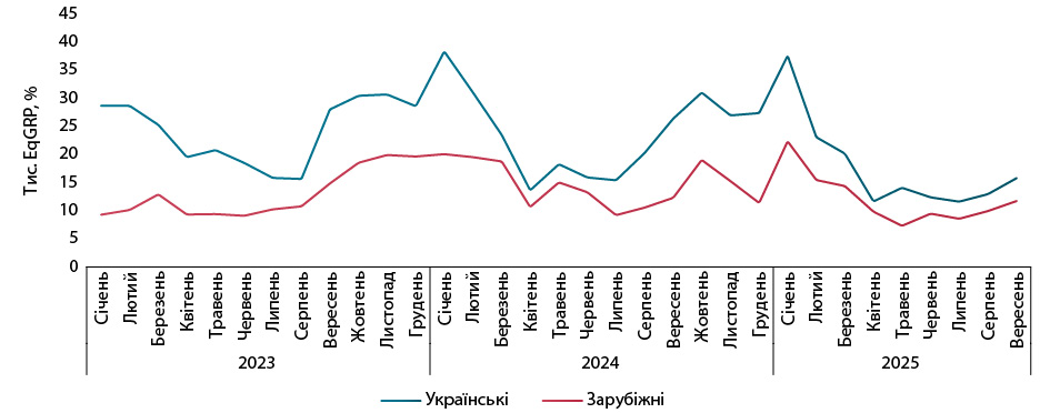 Українські маркетингові компанії демонструють вищий рівень активності на ТБ, ніж зарубіжні. Водночас у досліджуваний період активність знизилася в обох сегментах, причому серед українських гравців падіння більш відчутне, що скоротило розрив між локальними та зарубіжними рекламодавцями (рис. 5).