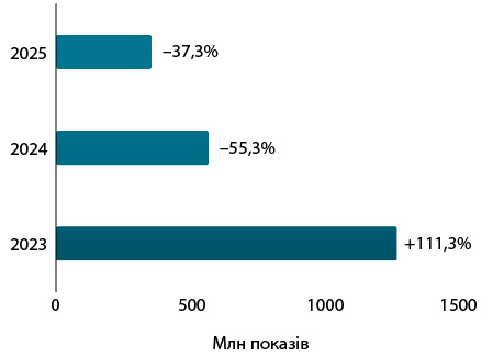 У цифровому середовищі динаміка також має тенденцію до зниження. За підсумками 9 міс 2025 р., зафіксовано 360 млн показів реклами фармацевтичних брендів в інтернеті, що на 37,3% менше, ніж торік (рис. 6), і на 72,0% нижче рівня 2023 р. Слід зазначити, що досить високі показники у 2023 р. зумовлені сплеском активності у березні. Моніторинг охоплює покази реклами на персональних комп’ютерах і не враховує мобільних пристроїв, тому повною мірою оцінити зсув аудиторії у бік споживання контенту на смартфонах і планшетах наразі неможливо, хоча цей фактор також впливає на загальну динаміку ринку.