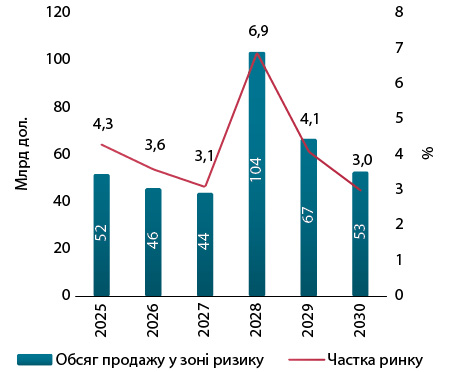 За оцінками аналітиків, втрата патентного захисту зачіпатиме близько 3–4% ринку щороку. Виняток становитиме 2028 р. з найвищим показником 6,9% (рисунок), коли завершиться термін дії патентів, що захищають один із найприбутковіших препаратів сьогодення.
