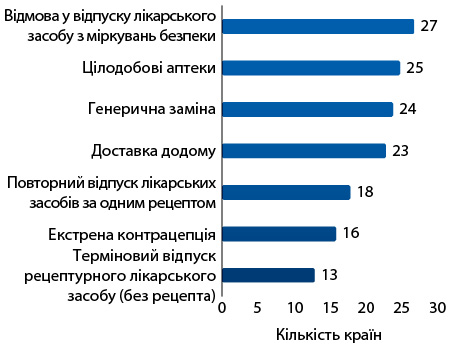 Послуги з відпуску лікарських засобів є основою діяльності аптек. До цієї когорти PGEU відносить також цілодобову роботу аптек, терміновий та екстрений відпуск рецептурного лікарського засобу без наявності рецепта (для невідкладної допомоги), повторний відпуск ліків у рамках одного рецепта, генеричну заміну (рис. 1). Також аптеки можуть пропонувати доставку лікарських засобів додому. Окреслені послуги доступні в багатьох країнах ЄС. Деякі з них відшкодовуються системами охорони здоров’я. Окрім власне забезпечення пацієнтів лікарськими засобами, ці послуги сприяють безперервній терапії. Слід зазначити, що фармацевт може відмовити у відпуску з міркувань безпеки, якщо вбачає ризики для пацієнта.