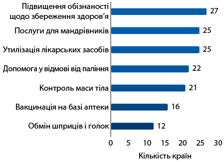 Аптеки активно долучаються до кампаній, що сприяють попередженню та профілактиці захворювань. Відповідні фармацевтичні послуги можуть включати підвищення обізнаності населення, вакцинацію на базі аптеки, допомогу у відмові від паління, контроль маси тіла, послуги з безпечної утилізації лікарських засобів, програми обміну шприців і голок (надання стерильних в обмін на використані), консультації для мандрівників (стосовно щеплень перед подорожжю, поради з захисту від інфекцій, складання аптечки) (рис. 2). Ці послуги можуть організовуватися в рамках національних або регіональних ініціатив.
