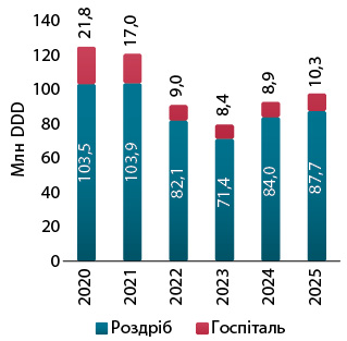 Після значного зменшення обсягів споживання внаслідок повномасштабного вторгнення рф в Україну, сегмент антибактеріальних препаратів поступово відновлюється. Основні обсяги традиційно припадають на роздрібний сегмент, що підкреслює значення амбулаторної ланки, контролю за рецептурним відпуском та фармацевтичної опіки.