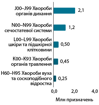 За даними RxTest, за підсумком 9 міс 2025 р. антибактеріальні препарати найчастіше призначали при хворобах органів дихання, сечостатевої системи, шкіри та підшкірної клітковини (рис. 2). Лідерами серед міжнародних непатентованих назв (МНН) за кількістю призначень у стаціонарі є цефтріаксон (Watch), цефазолін (Access) та метронідазол (Access), а в поліклініці — амоксицилін + клавуланова кислота (Access), азитроміцин (Watch) та цефіксим (Watch).