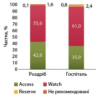Левова частка споживання припадає на групу Watch. У роздрібному сегменті ситуація більш збалансована завдяки більшій частці препаратів з Access. У госпітальному секторі позитивною тенденцією є вихід на лідерську позицію препарату з цієї групи. Це може свідчити про поступові зрушення в бік більш раціонального застосування антибактеріальних препаратів. Однак попереду ще багато роботи, щоб досягти переважання групи Access.