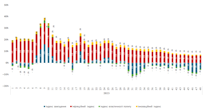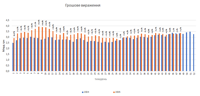 Рис. 4. Динаміка індикаторів зростання ринку лікарських засобів у грошовому вираженні з 1-го до 48-го тижня 2025 р. порівняно з аналогічним періодом минулого року