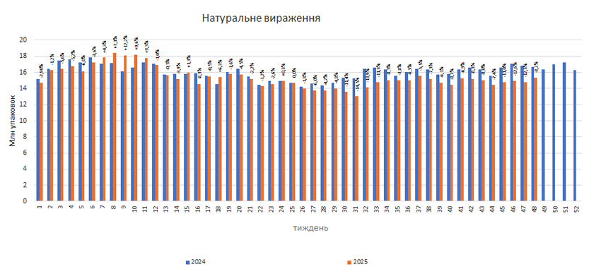 На 48-му тижні 2025 р. обсяги роздрібної реалізації препаратів зросли на 1,2% у грошовому вираженні та зменшилися на 8,2% у натуральному порівняно із показниками за аналогічний період минулого року. Показники розвитку підвищилися порівняно із показниками попереднього тижня, коли вони становили –2,3 та –12,3% відповідно (рис. 1).
