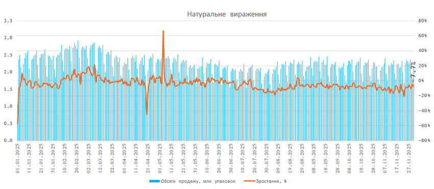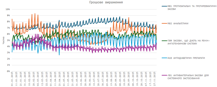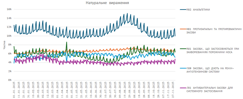Поденна динаміка обсягів аптечного продажу ліків свідчить про подовження тенденції до відновлення ринку. Станом на 1 грудня 2025 р. обсяги аптечного продажу ліків у гривневому вираженні зросли на 1,7%, а у натуральному зменшилися на −7,7% порівняно із аналогічним днем минулого року (з урахуванням відповідної доби тижня) (рис. 2).