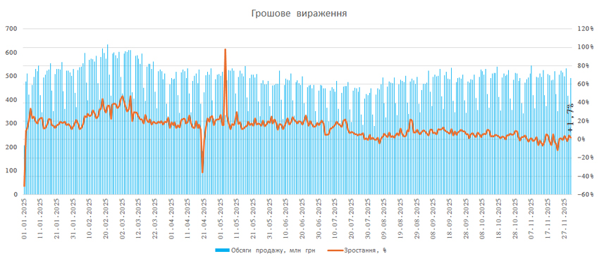 Рис. 2. Поденна динаміка обсягів аптечного продажу лікарських засобів з 1.01 до 1.12.2025 р.