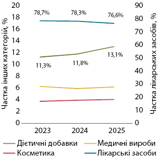 Рис. 3. Динаміка питомої ваги різних категорій товарів «аптечного кошика» за підсумками листопада 2023–2025 рр. у грошовому вираженні