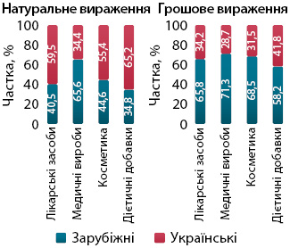 Рис. 4. Структура роздрібної реалізації товарів «аптечного кошика» українського і зарубіжного виробництва (за місцем виробництва) у грошовому і натуральному вираженні за підсумками листопада 2025 р. у розрізі категорій товарів