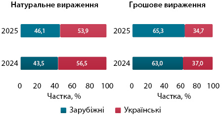 Рис. 5. Структура роздрібної реалізації товарів «аптечного кошика» українського і зарубіжного виробництва (за місцем виробництва) у грошовому і натуральному вираженні за підсумками листопада 2024–2025 рр.