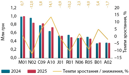 Рис. 1. Обсяги роздрібної реалізації товарів «аптечного кошика» у грошовому і натуральному вираженні, а також доларовому еквіваленті за підсумками листопада 2024–2025 рр. із зазначенням темпів зростання / зниження порівняно з аналогічним періодом попереднього року