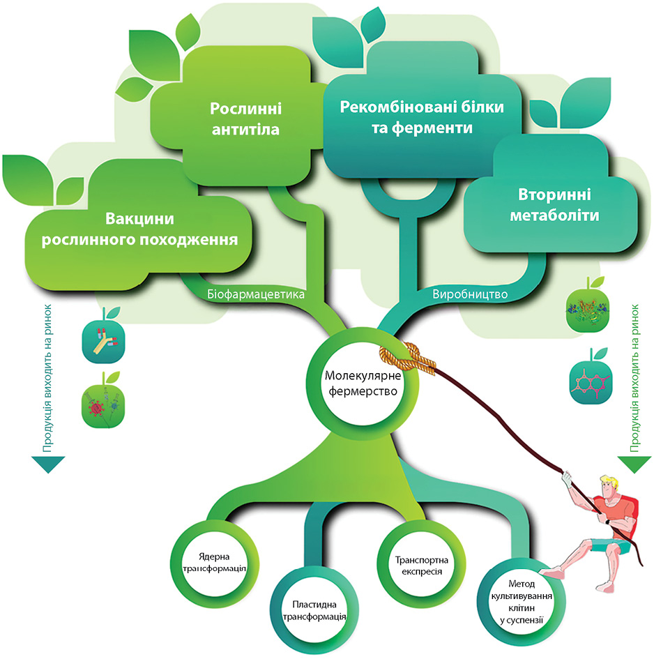 Поступово людство переходить від полів із зерном до полів із антитілами, від теплиць з овочами — до теплиць із білками плазми крові, від фермерства — до фармацевтичного фермерства: наразі розробляється понад 500 фармацевтичних продуктів на основі широкого спектра рослинних видів, які, як виявилося, є не лише джерелом їжі та кисню, а й однією з найкращих платформ для синтезу рекомбінантних білків, які можуть використовуватися у виробництві різних типів біологічних препаратів: антитіл, вакцин, ферментів, терапевтичних білків, гормонів та цитокінів (Das S. et al., 2021; Hager K.J. et al., 2022; Zahmanova G. et al., 2023). Зокрема, людський гормон росту, отриманий із трансгенного тютюну, став першим білком рослинного походження, підготовленим для медичного застосування (Das S. et al., 2021; Klocko A.L., 2022). Серед відомих прикладів молекулярного фармінгу варто виділити білок авідин, отриманий із насіння трансгенної кукурудзи; вакцину для птиці проти хвороби Ньюкасла, фермент із суспензії клітин моркви для лікування хвороби Гоше, «золотий рис» із високим вмістом бетакаротину (до 35 мкг/г) для боротьби з дефіцитом вітаміну А, кукурудзу з термостійкою амілазою в ендоспермі тощо (Tang G. et al., 2009; Das S. et al., 2021; Klocko A.L., 2022). Рослини наразі також стали платформою для виробництва низки моноклональних антитіл (Ко К. et al., 2005), як-от експериментальний коктейль антитіл, вироблений у тютюні, для лікування хвороби Ебола (Budzianowski J., 2015; Swope K. et al., 2022). У процесі розробки й культивування людського проінсуліну — його масове виробництво в коренях та пагонах суниці (Bharathi J.K. et al., 2024).
