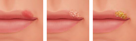 Герпес на губах можна легко діагностувати на основі типових симптомів. Інфекційний процес зазвичай розпочинається з відчуття натягнутості, почервоніння шкіри та характерного свербежу, після чого формуються наповнені рідиною везикули. Ці пухирці можуть поширюватися на слизову оболонку рота, носа або прилеглі ділянки обличчя. Через свою крихкість вони легко розкриваються під час розмови, сміху чи жування, вивільняючи рідину, що часто супроводжується подразненням при контакті з кислими напоями чи продуктами. Згодом ранки вкриваються сухою кіркою та поступово загоюються, проте сам вірус назавжди залишається в організмі, що зумовлює появу повторного висипу в майбутньому (рисунок) (InformedHealth.org, 2006–2025).
