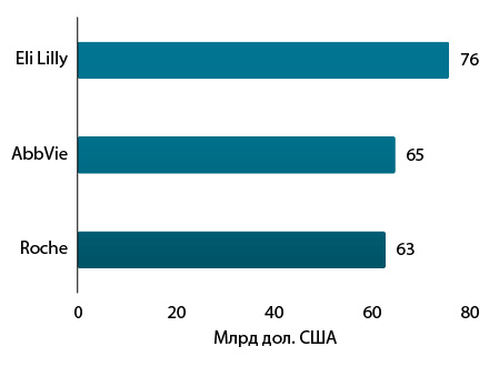 Справжня боротьба розгорнеться за 2-ге місце. За оцінками аналітиків, його посяде компанія AbbVie, яка має у своєму портфелі блокбастери Skyrizi (рисанкізумаб), призначений для лікування середньотяжкого та тяжкого бляшкового псоріазу у дорослих, які є кандидатами на системну терапію або фототерапію, та активного псоріатичного артриту у дорослих, а також Rinvoq (упадацитиніб) для лікування дорослих пацієнтів із середньої тяжкості та тяжкою формою активного ревматоїдного артриту, які мали недостатню реакцію або непереносимість одного або декількох блокаторів фактора некрозу пухлини. Топ-3 замикатиме компанія Roche, яка також має кілька блокбастерів, що набувають популярності, на чолі з Vabysmo (фарицимаб) для лікування пацієнтів із неоваскулярною (вологою) віковою макулярною дегенерацією, діабетичним макулярним набряком та макулярним набряком після оклюзії ретинальної вени.