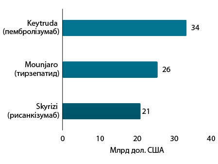 Рейтинг брендів лікарських засобів за обсягами світового продажу у 2026 р., як очікується, збереже за собою Keytruda (пембролізумаб) — інгібітор імунних чекпойнтів PD-1, що має показання до застосування при багатьох типах пухлин (рис. 2). Це стало можливим, зокрема, завдяки лончу ін’єкційної форми комбінації пембролізумаб + берагіалуронідаза альфа, що забезпечує швидше введення. Це дозволило подовжити життєвий цикл бренду. У топ-3 також увійшли Mounjaro (тирзепатид) та Skyrizi (рисанкізумаб).