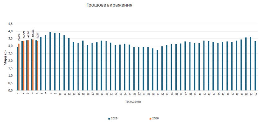 Рис. 4. Динаміка індикаторів зростання ринку лікарських засобів у грошовому вираженні з 1-го до 5-го тижня 2026 р. порівняно з аналогічним періодом минулого року
