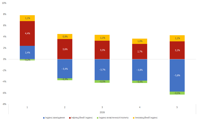Після тривалого зниження інфляційна складова, яка відображає зміну обсягів аптечного продажу лікарських засобів у грошовому вираженні за рахунок зміни ціни, дещо підвищилася. На 5-му тижні 2026 р. вона становить 3,2% (рис. 4).