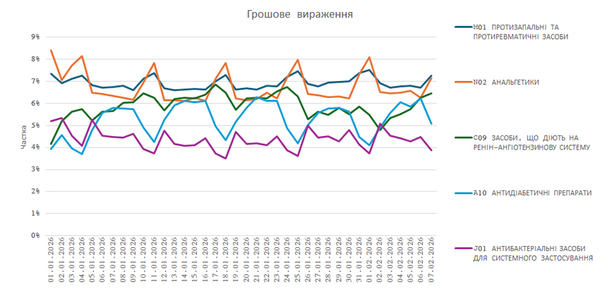 За підсумками січня 2026 р., обсяги аптечного продажу лікарських засобів зменшилися на 0,1% у грошовому та на 7,2% у натуральному вираженні порівняно із показниками за січень 2025 р. Потижнева динаміка свідчить, що протягом січня на ринку фіксувалися негативні тенденції. Щотижня показники розвитку ринку погіршувалися. На початку лютого 2026 р. вони також поки що не вселяють оптимізму. За період з 1 до 7 лютого 2026 р. обсяги роздрібної реалізації ліків зменшилися на 5,7% у грошовому та на 11,3% у натуральному вираженні порівняно з аналогічним періодом минулого року. Тобто можна відзначити, що негативні тенденції зберігаються і на початку лютого. Рівень захворюваності на грип та гострі респіраторні вірусні інфекції (ГРВІ) поступово зростає, але все ще нижче епідпорогу. За даними Центру громадського здоров’я, на 5-му тижні 2026 р. інтенсивний показник захворюваності на ГРВІ, включно із COVID-19, становить 410,6 на 100 000 населення. Відсутність епідсезону є одним із факторів негативних тенденцій на ринку. У цій публікації розглянуто показники динаміки ринку у 2026 р. Для підготовки матеріалу використані дані аналітичної системи дослідження ринку «PharmXplorer» компанії «».