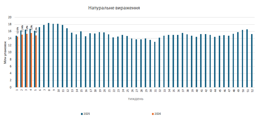 За підсумками 5-го тижня 2026 р. обсяги роздрібної реалізації лікарських засобів зменшилися на 2% у грошовому та на 8,1% у натуральному вираженні порівняно із показниками за аналогічний період минулого року (рис. 1). Показники розвитку дещо погіршилися порівняно із попереднім тижнем, коли вони становили –0,5% у грошовому та –7,0% у натуральному вираженні.