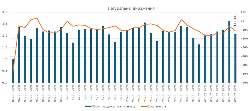 Поденна динаміка обсягів аптечного продажу ліків свідчить, що негативна тенденція зберігається і на 6-му тижні. Станом на 7.02.2026 р. обсяги роздрібного продажу ліків зменшилися на 4,7% у грошовому та на 11,3% у натуральному вираженні порівняно із показниками за аналогічний день (з урахуванням відповідної доби тижня) 2025 р. (рис. 2).