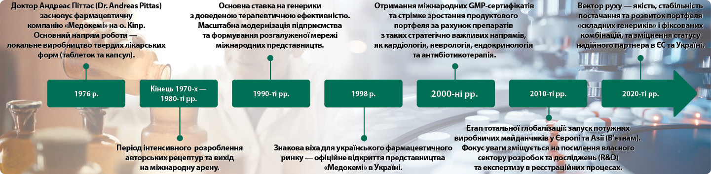 2026 р. знаменує величну віху в історії світової фармації — «золотий» ювілей міжнародної компанії «Медокемі». За ці пів століття компанія здійснила вражаючий прорив: від локального виробника твердих лікарських форм (таблеток і капсул) з 8 співробітниками та 3 машинами (для виготовлення таблеток, капсульного наповнення та упаковки) до глобального гравця фарміндустрії, внесок якого у розвиток виробництва генеричних препаратів визнано мільйонами (рисунок).