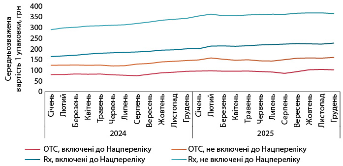 Рис. 2. Динаміка середньозваженої вартості 1 упаковки рецептурних та безрецептурних лікарських засобів, включених та не включених до Нацпереліку