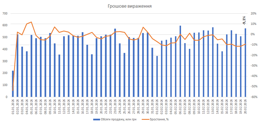 Рис. 2. Поденна динаміка обсягів аптечного продажу лікарських засобів з 1.01 до 20.02.2026 р.