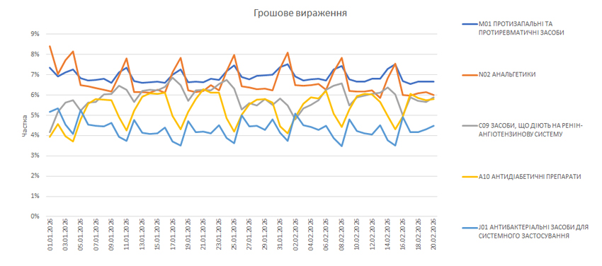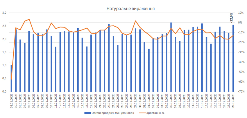 Водночас поденна динаміка обсягів аптечного продажу ліків свідчить, що на 8-му тижні показники розвитку знов знизилися. Станом на 20.02.2026 р. обсяги роздрібного продажу препаратів зменшилися на 9,1% у грошовому вираженні та на 12,9% у натуральному порівняно із показниками за аналогічний день (з урахуванням відповідної доби тижня) 2025 р. (рис. 2).