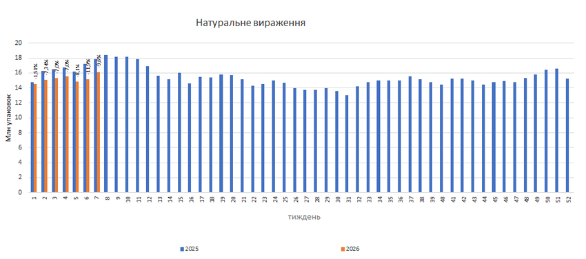 За підсумками 7-го тижня 2026 р. обсяги роздрібної реалізації лікарських засобів зменшилися на 3,3% у грошовому вираженні та на 9,6% у натуральному порівняно із показниками за аналогічний період минулого року (рис. 1). Показники розвитку дещо підвищилися порівняно із попереднім тижнем, коли вони становили −5,9% у грошовому та −11,9% у натуральному вираженні.