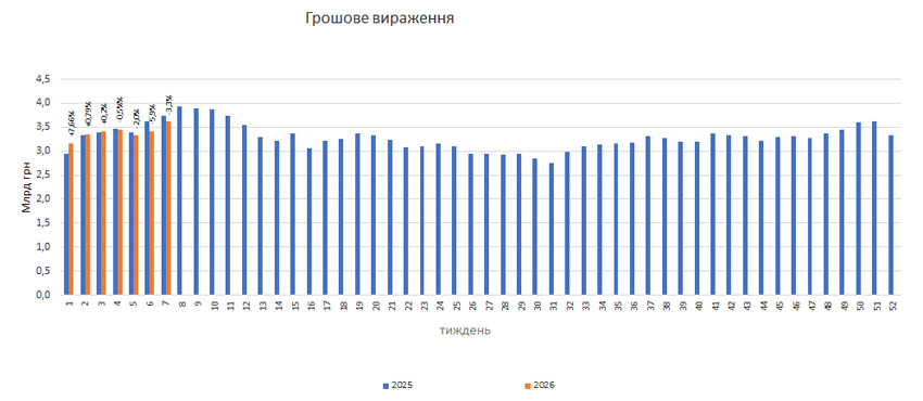 Рис. 1. Потижнева динаміка обсягів аптечного продажу лікарських засобів з 1-го тижня 2024 до 7-го тижня 2026 р.