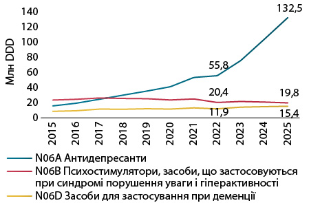 У межах групи N06 «Психоаналептики» домінує роздрібний сегмент, що свідчить про переважно амбулаторний характер лікування. Ключову роль у цій групі наразі відіграють антидепресанти (N06A), які демонструють виражене зростання обсягів роздрібного споживання у встановлених добових дозах (defined daily dose — DDD), особливо після 2022 р. (рис. 1). Важливо зазначити, що доступні на ринку антидепресанти є рецептурними, а отже, їх застосування має відбуватися лише за призначенням лікаря.