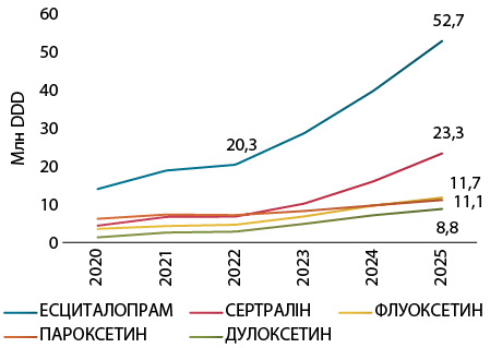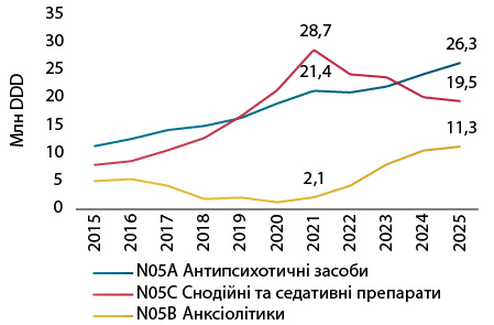 Основним драйвером є група антидепресантів, де домінують препарати 1-ї лінії терапії. Паралельно посилюється роль антипсихотиків та анксіолітиків. Водночас після пікового зростання в період пандемії COVID-19 скорочується споживання снодійних і седативних засобів. Це може свідчити про перехід до більш системної терапії.