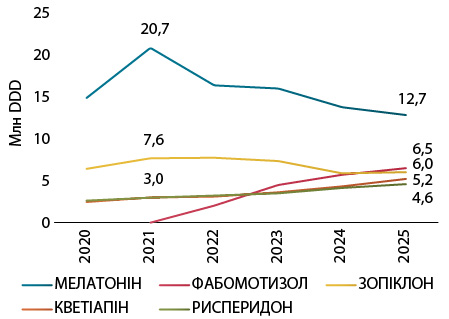 У розрізі МНН у 2020–2021 рр. відзначали значне зростання споживання мелатоніну, після чого відбулося часткове його зниження. Водночас після 2022 р. підвищилося споживання кветіапіну (рис. 4).