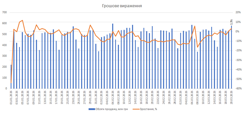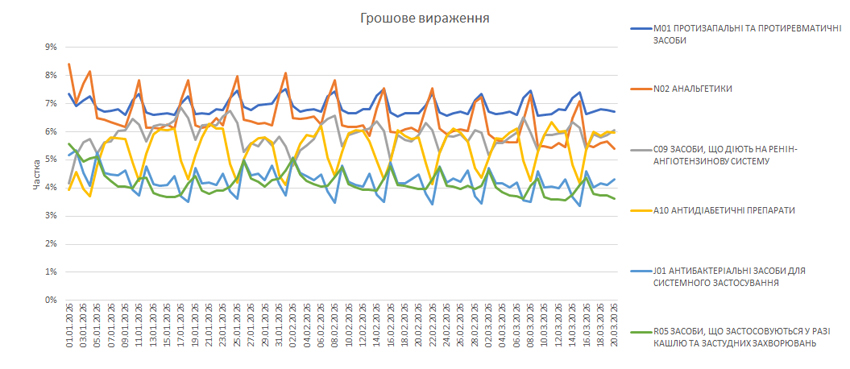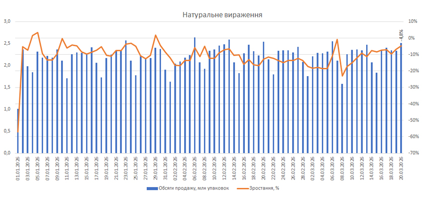 Поденна динаміка обсягів аптечного продажу ліків також демонструє покращення показників розвитку та їх перехід у позитивну площину в грошовому вираженні. Станом на 20.03.2026 р. обсяги роздрібного продажу ліків зросли на 3,3% у грошовому та на 4,8% у натуральному вираженні порівняно із показниками за аналогічний день (з урахуванням відповідної доби тижня) 2025 р. (рис. 2).