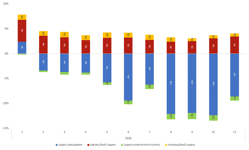 Ціни на ліки також залишаються відносно стабільними. Інфляційна складова, яка відображає зміну обсягів аптечного продажу лікарських засобів у грошовому вираженні за рахунок зміни ціни, на 11-му тижні 2026 р. становить 3% (рис. 4).