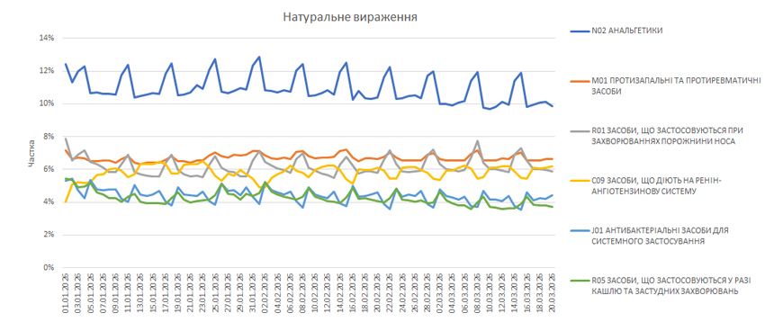 У розрізі груп АТС-класифікації 2-го рівня продовжується тенденція до зменшення частки анальгетиків та протизастудних засобів у загальній структурі аптечного продажу ліків. Незначне зростання фіксується для антигіпертензивних препаратів групи С09 (рис. 3).