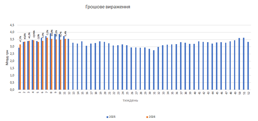 За підсумками 11-го тижня 2026 р. обсяги аптечного продажу лікарських засобів зменшилися на 5,4% у грошовому та на 11,8% у натуральному вираженні порівняно із показниками за аналогічний період минулого року (рис. 1). З 11-го тижня показники розвитку ринку почали покращуватися порівняно із такими попереднього тижня, коли вони становили –9,7% у грошовому та –15,6% у натуральному вираженні.