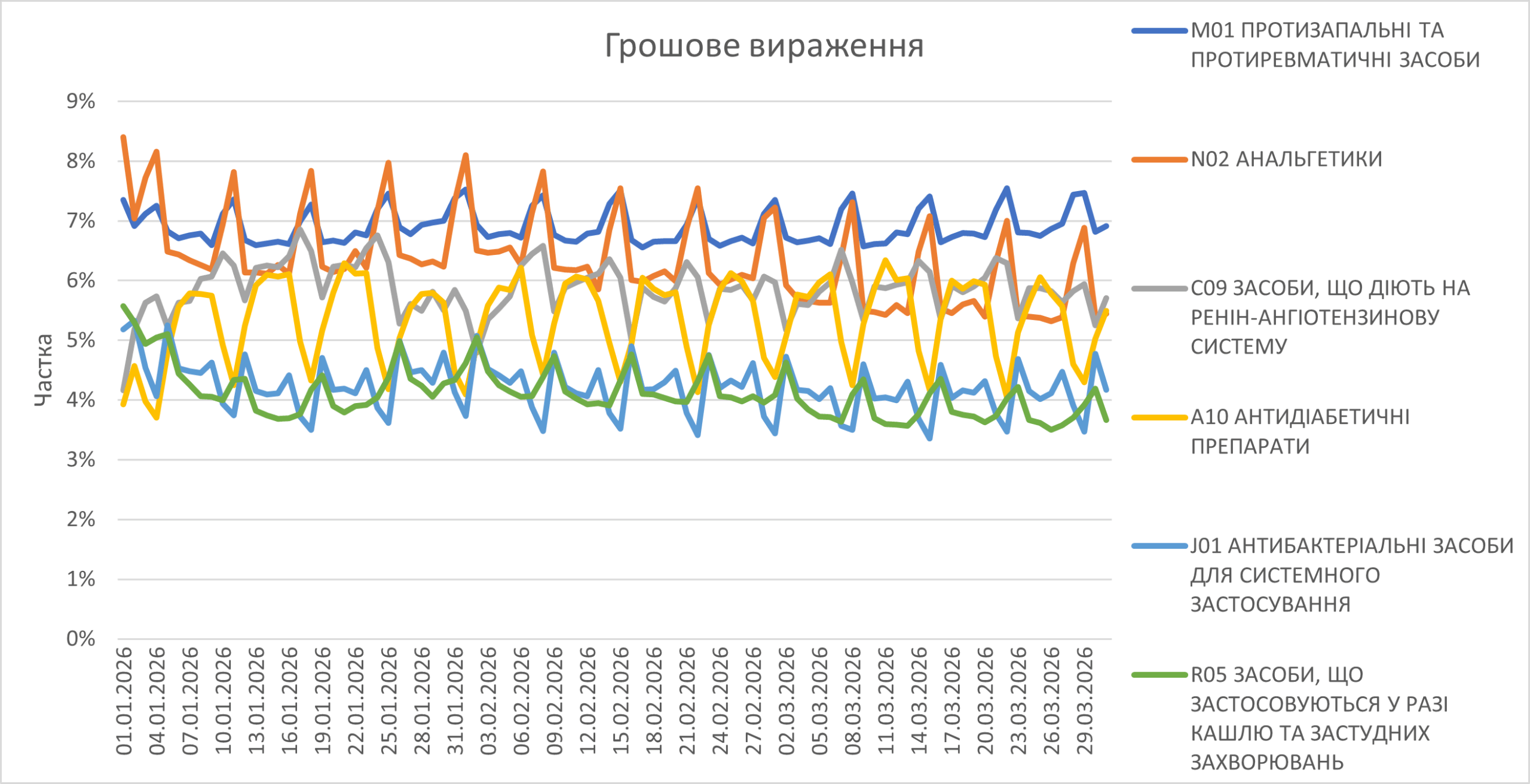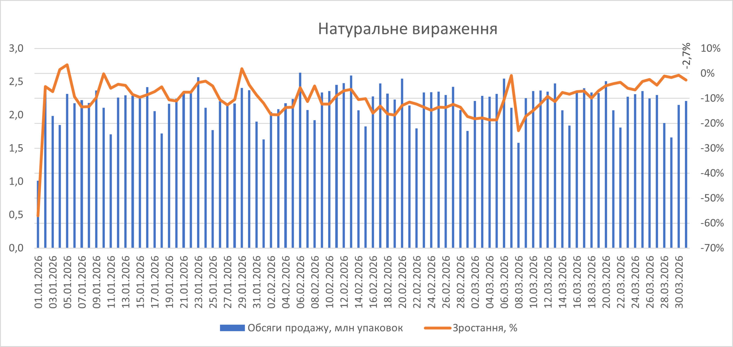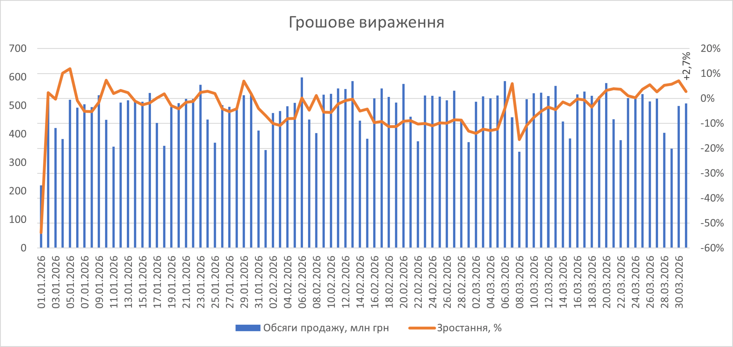 Рис. 2. Поденна динаміка обсягів аптечного продажу лікарських засобів з 1.01 до 31.03.2026 р.