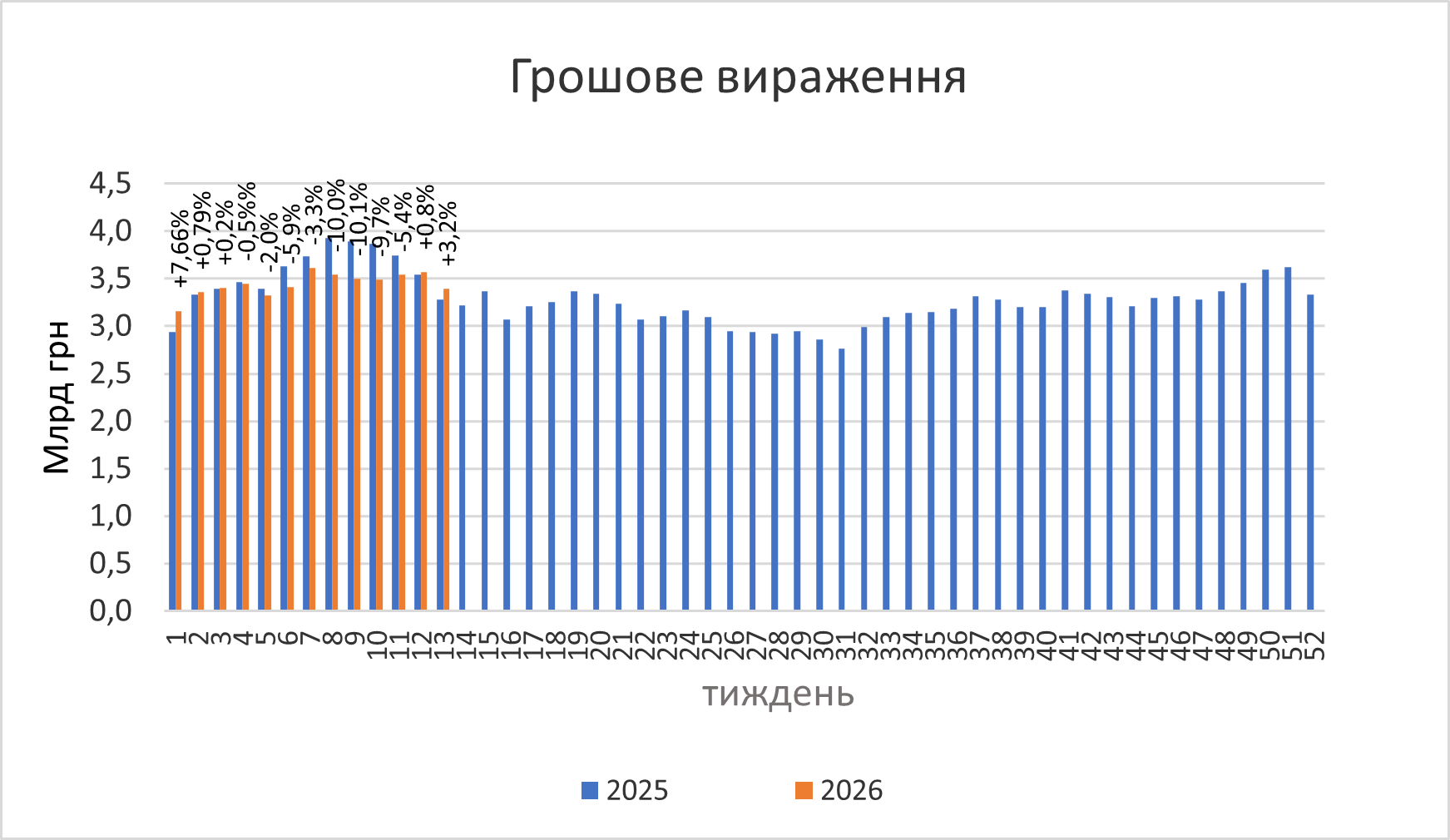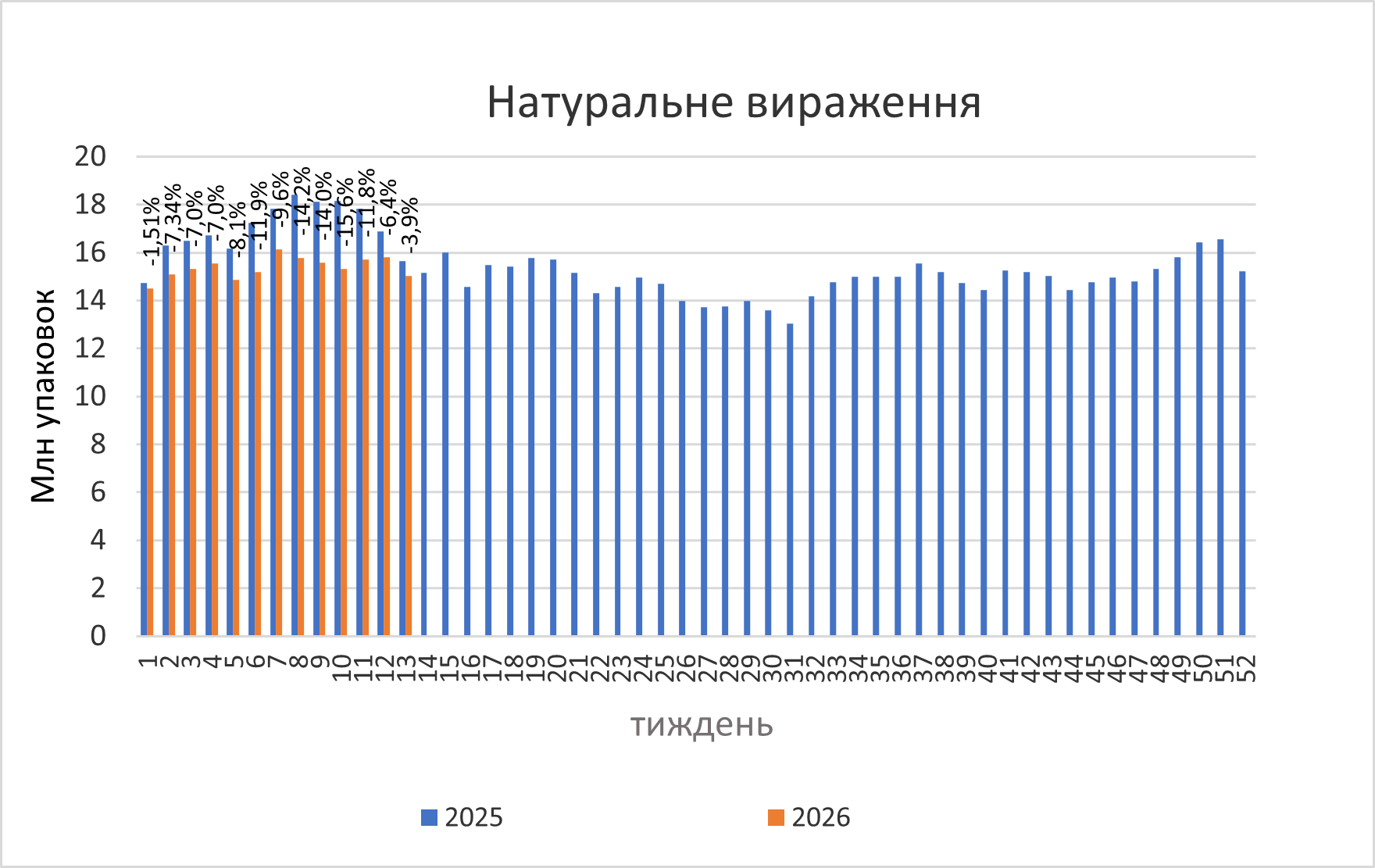 Рис. 1. Потижнева динаміка обсягів аптечного продажу лікарських засобів з 1-го тижня 2025 до 13-го тижня 2026 р.