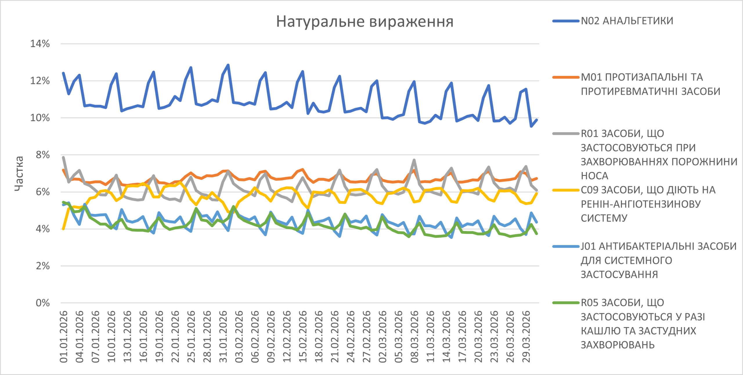 У розрізі груп АТС-класифікації 2-го рівня продовжується тенденція до зменшення частки анальгетиків та протизастудних засобів у загальній структурі аптечного продажу ліків. Незначне зростання фіксується для препаратів групи М01 (рис. 3).