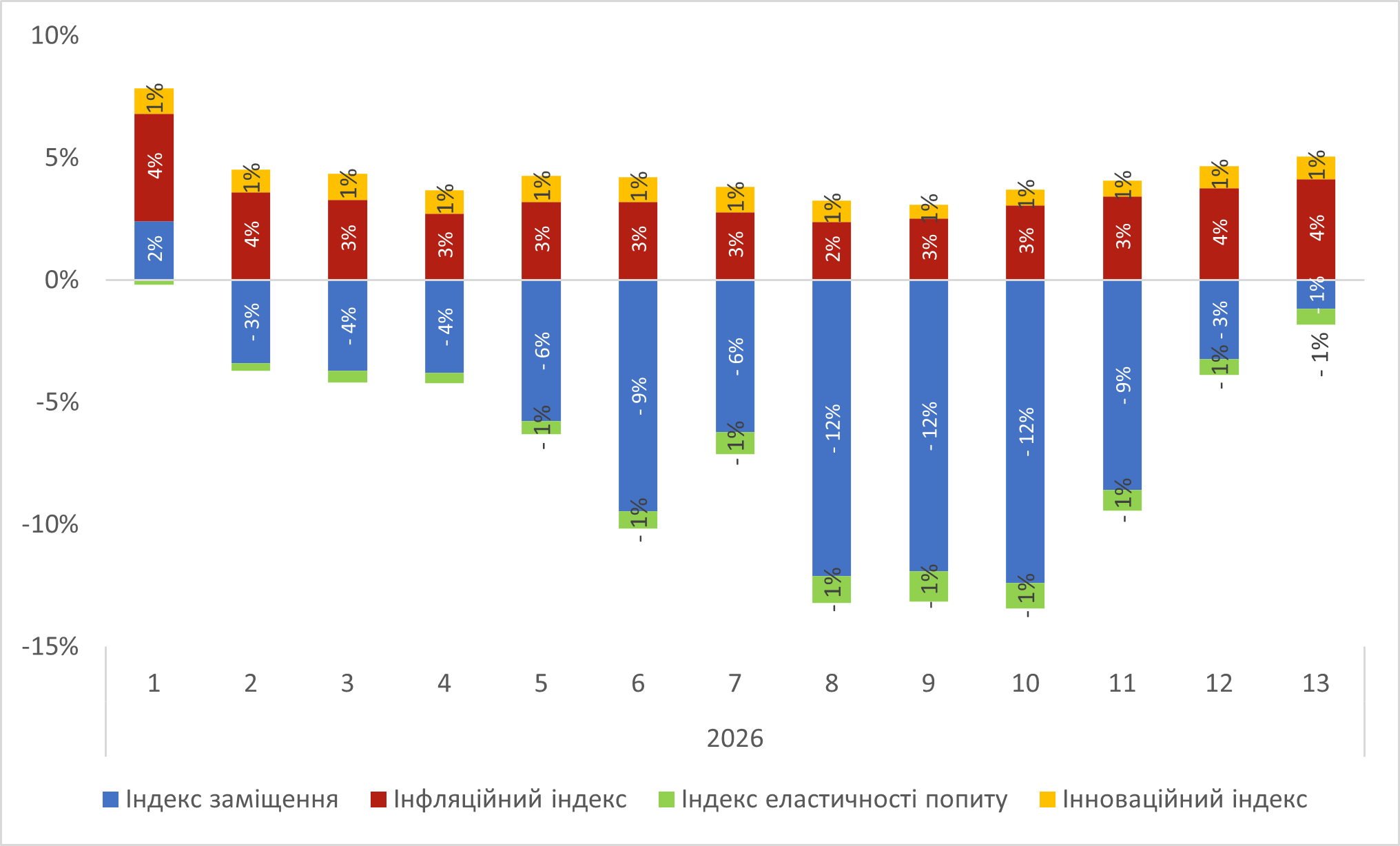 Інфляційна складова, яка відображає зміну обсягів аптечного продажу лікарських засобів у грошовому вираженні за рахунок зміни ціни, поступово зростає і на 13-му тижні 2026 р. становить 4% (рис. 4).