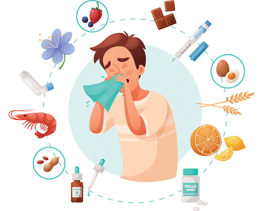 Алергія — патологічна реакція імунної системи на чужорідні речовини (алергени), які зазвичай нешкідливі для більшості людей. До поширених алергенів належать наступні: пилок, домашні пилові кліщі, шерсть тварин, отрута комах, деякі продукти харчування, певні ліки, контактні алергени (наприклад метали або ароматичні інгредієнти), пліснява тощо1.
