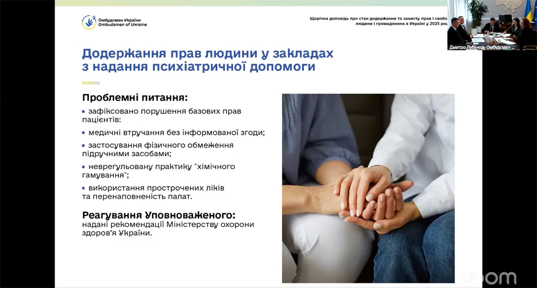 У сфері захисту прав дитини у 2025 р. проведено 826 виїзних та 110 безвиїзних моніторингових візитів. За їх результатами виявлено системні порушення у закладах інституційного догляду, зокрема випадки використання госпіталізації як форми покарання, застосування психотропних препаратів для стримування поведінки дітей. У закладах охорони здоров’я зафіксовано порушення принципу добровільної згоди на лікування, зокрема випадки госпіталізації дітей за відсутності медичних показань до стаціонарного лікування. Також виявлено неналежні умови перебування у психіатричних відділеннях.