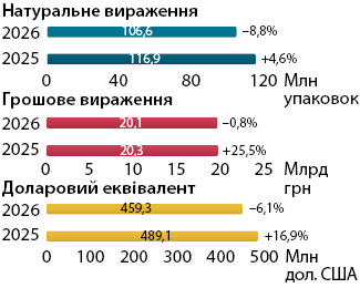 У березні 2026 р. обсяги роздрібної реалізації товарів «аптечного кошика» зменшилися на 0,8% у гривневому вираженні порівняно з аналогічним періодом попереднього року. У доларовому еквіваленті фіксується їх зменшення на 6,1%, а у натуральному вираженні зменшення обсягів продажу становило 8,8%. У досліджуваний період продовжується тенденція до зростання частки товарів зарубіжного виробництва. Також продовжує збільшуватися частка рецептурних лікарських засобів у загальній структурі ринку. Триває й тенденція до зростання частки дієтичних добавок у загальній структурі роздрібної реалізації товарів «аптечного кошика». За підсумками березня 2026 р. вона сягнула 12,8% у гривневому вираженні. Суттєве збільшення обсягів продажу фіксується для антидіабетичних препаратів (група А10). У цій публікації до уваги читачів представлені ключові показники фармацевтичного ринку Украї­ни (території, підконтрольної українському Уряду) у березні 2026 р. При підготовці матеріалу використані дані аналітичної системи дослідження ринку «PharmXplorer» компанії «Proxima Research».