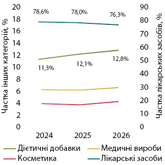 Рис. 3 Динаміка питомої ваги різних категорій товарів «аптечного кошика» за підсумками березня 2024–2026 рр. у грошовому вираженні