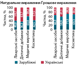Рис. 4 Структура аптечного продажу товарів «аптечного кошика» українського і зарубіжного виробництва (за місцем виробництва) в грошовому і натуральному вираженні за підсумками березня 2026 р. у розрізі категорій товарів
