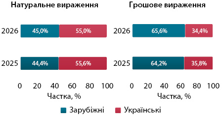 Рис. 5 Структура аптечного продажу товарів «аптечного кошика» українського і зарубіжного виробництва (за місцем виробництва) в грошовому і натуральному вираженні за підсумками березня 2025–2026 рр.